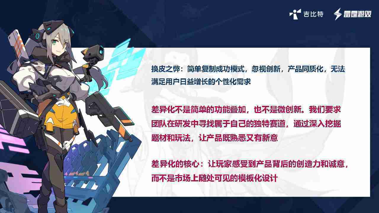 在我们内部是这么定义差异化的。。首先,,,,差异化不是简单的功能叠加,,,,更不是换皮。。只是换皮,,产品无法提供有效的市场价值。。。。内部经常说差异化的产品不是为了迎合市场,,,,而是找到一个自己独特的表达方式,,,在研发中找到属于自己的细分赛道和独特赛道,,,,前提是需要对这个题材有足够的深入、、、、挖掘,,对玩法有足够深入的理解,,,,让产品看起来既熟悉又有新意。。。。