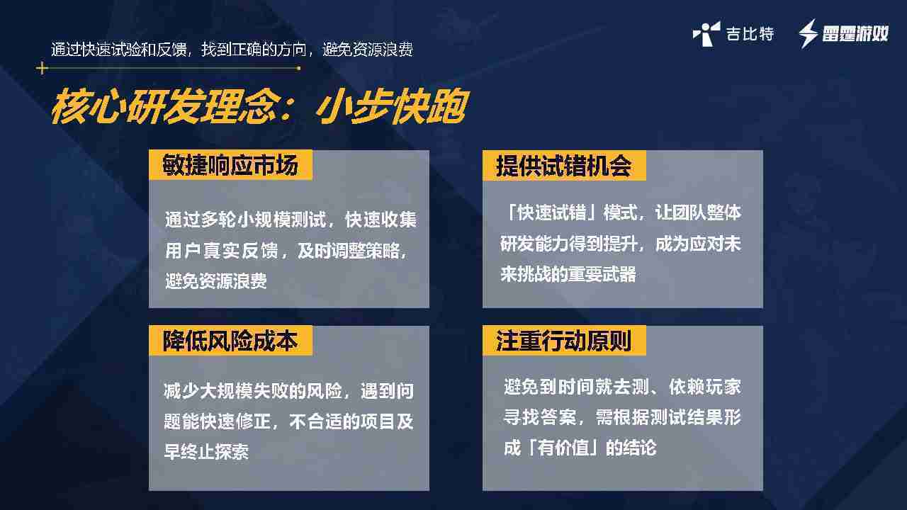 小步快跑不是找答案,,而是验证答案。。。。我们之前有项目是这样的,,,有些制作人会有几个方向觉得都可以做,,,但是不确定做哪一个,,会选择几个都做,,做完拿到市场跑,,跑出哪一个更好,,基于这个再做后续的研发和拓展。。。但这种情况最容易出现一个问题,,可能被玩家裹胁,,,玩家说这个点不错、、那个点不错,,,,到底听还是不听,,,不听感觉是无视玩家的反馈,,,听的话,,,可能自己没想清楚导致研发思路发生偏颇。。。。所以针对这一点后面自己复盘整理,,,发现制作人自己心里要有数,,,,要做自己觉得好玩的,,,而且明确知道这个东西是你想做的,,,,然后拿到市场验证这个答案是不是对的,,而不是拿一堆答案找哪一个答案更好。。