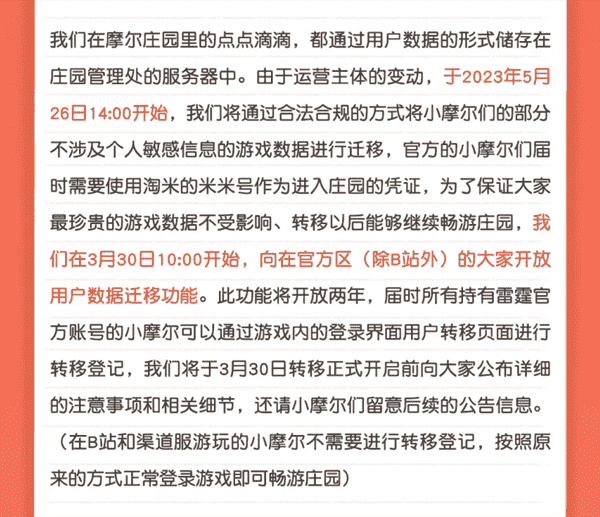 合作结束本就是开发方和代理方双方的事情,,,,降低这件事情对玩家的影响,,才是对所有珍视这段童年的摩尔玩家最好的呵护。。。目前看来,,用户完全不用担心后续因无法登录游戏而造成任何数据上的损失,,,,只要及时进行账号转移,,,,就可以好好保留、、、延续在庄园的痕迹和回忆,,继续在庄园里做快乐的红鼻子小鼹鼠。。