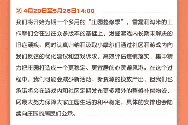 合作的结束并不意味着这个童年IP的结束,,,,对于《摩尔庄园》手游而言,,这是一个新阶段的开始。。后续游戏内将开启庄园重构计划,,会就以往遗留下来的BUG进行集中修复,,并在游戏内和社区定期发布更多补偿物资。。。。