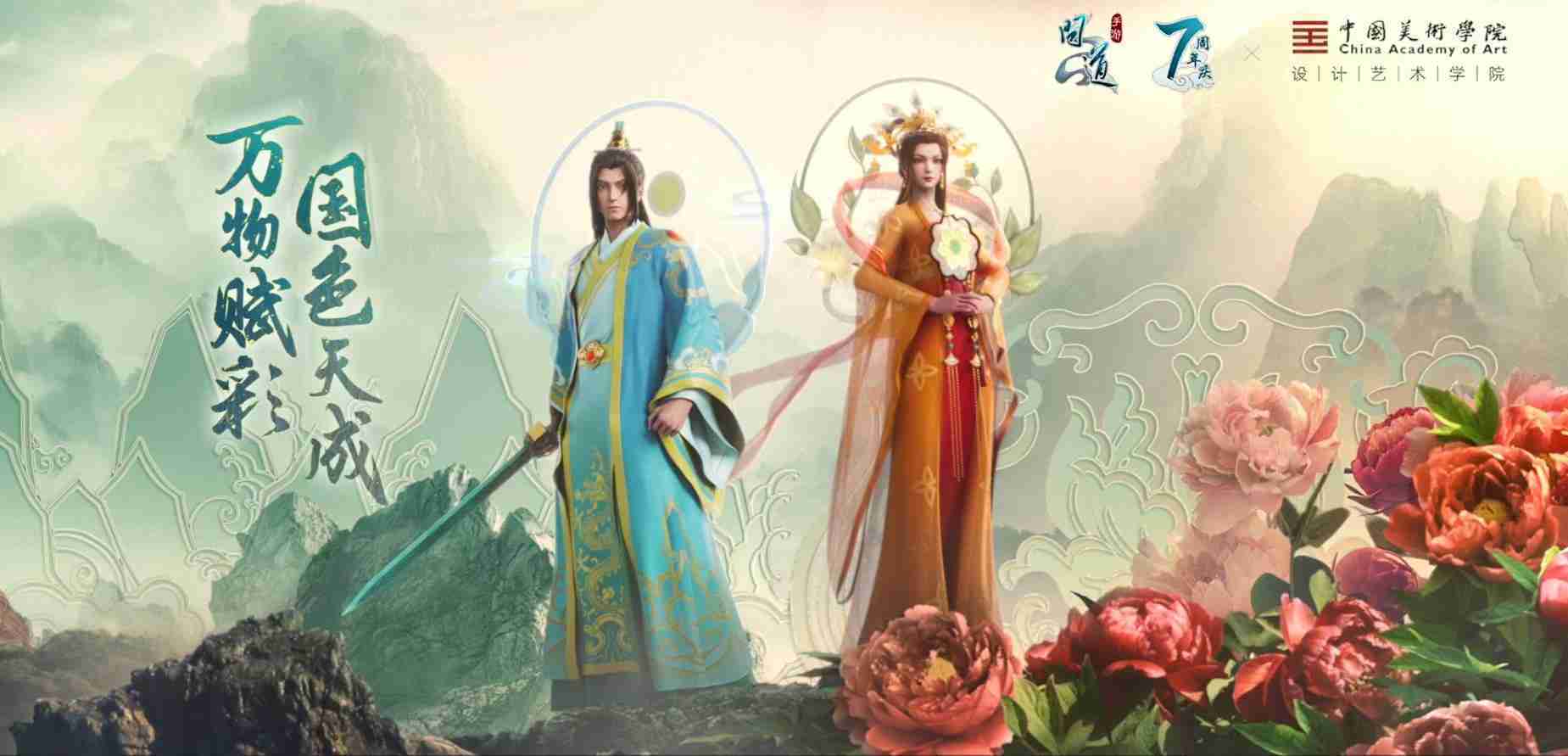 2023年4月,,,《问道手游》联动中国美术学院,,,在游戏中融合了中国历史上不同时期的文化元素,,打造了“山河万象”与“凤鸣九霄”的国风时装。。。在色彩配置方面,,,,创作团队基于对游戏角色特性的分析提取相应的文化内涵,,,从每一种色彩的色相、、、指代事物和情感出发对应角色属性,,,选定服装的色彩搭配。。在纹样设计方面,,,创作团队结合游戏角色自身特殊的造型比例和形态,,,,在实际的纹样设计中进行了游戏语境下的活化演绎。。男性角色集中使用了如蟒纹、、、、海水江崖纹、、如意纹和云气纹等传统纹样元素,,,女性角色则吸纳了凤凰纹、、牡丹纹、、卷草缠枝纹等元素,,组成以“双凤牡丹纹样”“缠枝牡丹纹”“金玉凤冠头饰”为主要纹样的游戏角色装饰图案系统。。。。